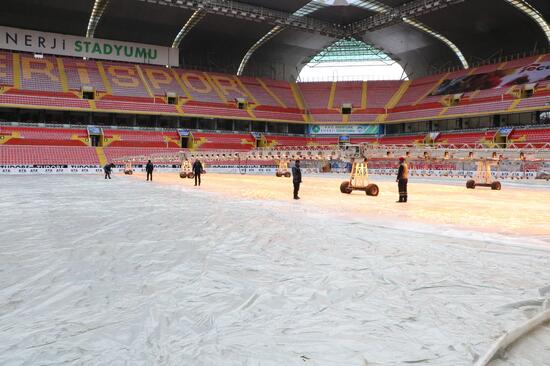 Stadyum müdürü Ali Yılmaz, “Kış döneminde yerin rutin müdafaaları yapılıyor. Yapay çim güçlendirme araçları, yapay ışıklandırma vererek çimlerin güçlendirilmesini sağlıyoruz. Bunu esasen kış boyunca alanda gezdirerek yapıyoruz. Kar yağışının akabinde inanılmaz bir soğuk vardı. Hava sıcaklıkları eksi 17, 18 hatta 20’lere kadar düştü. Burada bu sistem kâfi olmuyor. Ekstradan hami bir örtü sermemiz gerekti. Hava alabilen bir örtü ile bir de naylon örtülerimiz var. Biz hava çok soğuk olduğu için naylon örtüleri tercih ettik. 2-3 gün yerin üzerini naylonla kapattık. 2-3 günde bir de örtüyü kaldırıp, havalandırma yaptık. Bu biçimde çimin sağlıklı kalmasını sağladık” dedi.