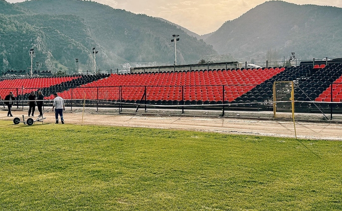 Kendisi için tarihi nitelikteki maç öncesi İlçe Stadı’nda dönem başında yıkılan kapalı tribünün yerine 3 bin kişilik portatif tribün kurduran Fethiyespor, tabanı tenkit alan sahayı da bakımdan geçirdi.
